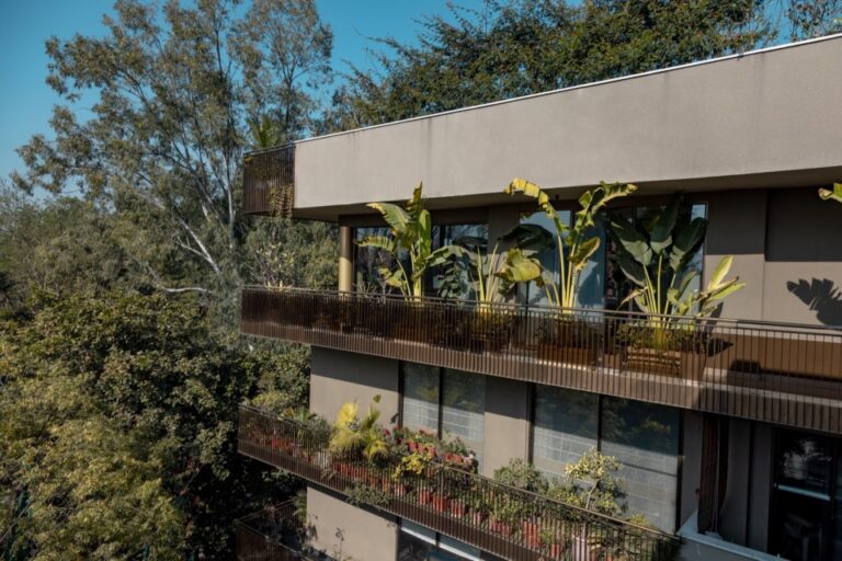 A unique junction of glass partitions in a zig-zag profile envelops the shared space of the home, mimicking the rhythm obtained when curtains are drawn across windows. A combination of clear and fluted glass creates a dynamic modulation of natural light entering the space with views that connect the internal space to the surrounding treetops. The residence’s harmony with its environment is further enhanced by long balconies generously populated with potted plants.