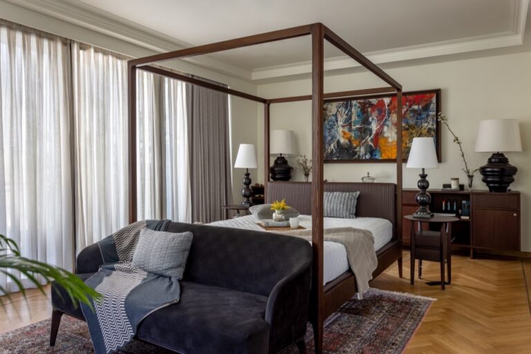 Characterised by a restrained palette of chevron-patterned wooden flooring and white walls, the bedrooms feature details such as cornices that add a layer of depth to the pristine white walls. A contemporary reinterpretation of an antique bed, reminiscent of the owner’s Calcutta roots, serves as the room’s focal point. The master bedroom, with its sliding glass partition, opens out to a banyan tree, reflecting the owner’s affinity for nature.