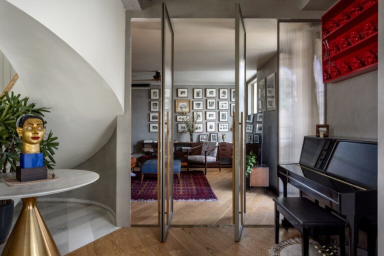 The piano nook features a sculpture of monkeys in striking red, a work of designer Arun Kumar. The sculpture and the Binic lamp by Lonna Vautrin contrast the glossy black of the piano, yielding a distinctive aesthetic to this corner. Basked in natural light filtering through a bay window, the timber-infused study area beyond the piano nook creates a comfortable, focused environment. The study desk and chair are tucked within the bay window, offering views of the verdant landscape. The natural oak flooring of the adjacent living room seamlessly flows over into the study area, establishing a sense of continuity. This area, too, like all the other spaces of the home, is a container for the owner’s treasures—photographs depicting his family heritage and antique pieces hold prominence, with the furniture and materials unfolding around them.