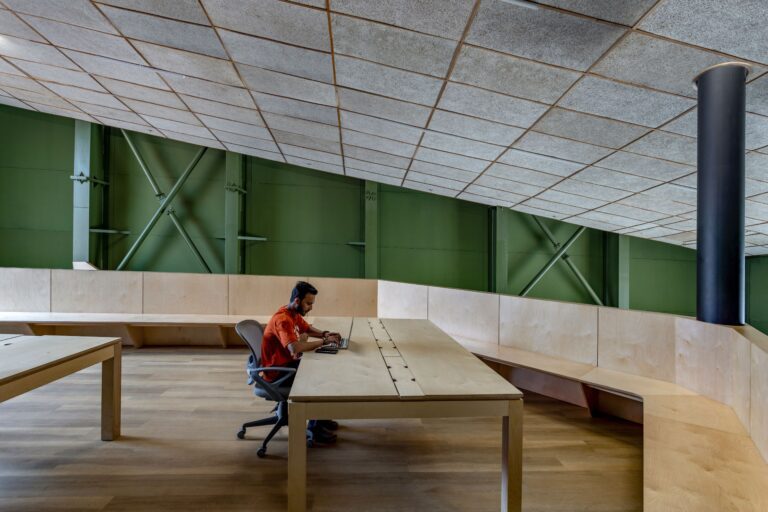 The building was revitalized by reinforcing the columns with steel jacketing and replacing the old trusses and roof. The outdated asbestos roof has been revamped with a modern pre-insulated profile sheet, accompanied by a central skylight installed along its ridge. This upgrade floods the interior with natural daylight, redefining the atmosphere within. Further enhancements include the incorporation of light shelves at lintel level and the refurbishment of windows with high-performance insulating glass, amplifying the overall scheme and setting up well-lit environments conducive to productivity. Through this adaptive reuse approach, the workspace was made operable in two months, optimizing construction time and minimizing the project’s carbon footprint.