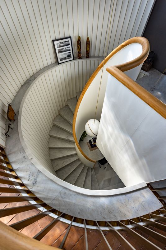 The private quarters take the owner to his Bengali roots; it is composed of white walls and chevron wooden floors. The master bedroom opens onto a Banyan tree, reflecting the owner’s affinity for nature. The flooring here is art in itself, a mosaic of Carrara, Swiss White, and Thassos marble laid in an argyle weave, cool underfoot yet warm in tone.