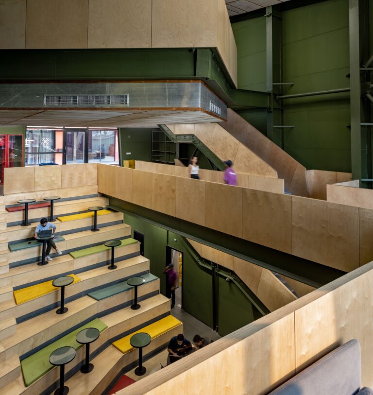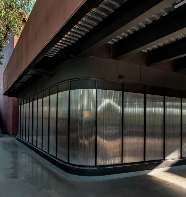 Designed as a dynamic work hub that prioritizes the holistic well-being of the company’s employees, the development includes facilities such as a gym and a breakout terrace with a garden located at the rear entry. Employees move through the events block to access the terrace, which includes casual seating and a view of the plot’s verdant landscape. The terrace houses a kitchen garden that feeds the workspace’s cafeteria, promoting a sense of self-sufficiency and encouraging employees to embrace locally sourced, fresh produce. Below, a gym, parking area and pedestrian zone are accessed through a permeable boundary of bollards at the rear entrance of the plot. The gym’s exterior is clad in fluted polycarbonate sheeting, seamlessly blending the facility with its context. The campus is designed to engage with its surroundings, becoming not just a standalone facility, but a catalyst for community interaction at the neighborhood level.