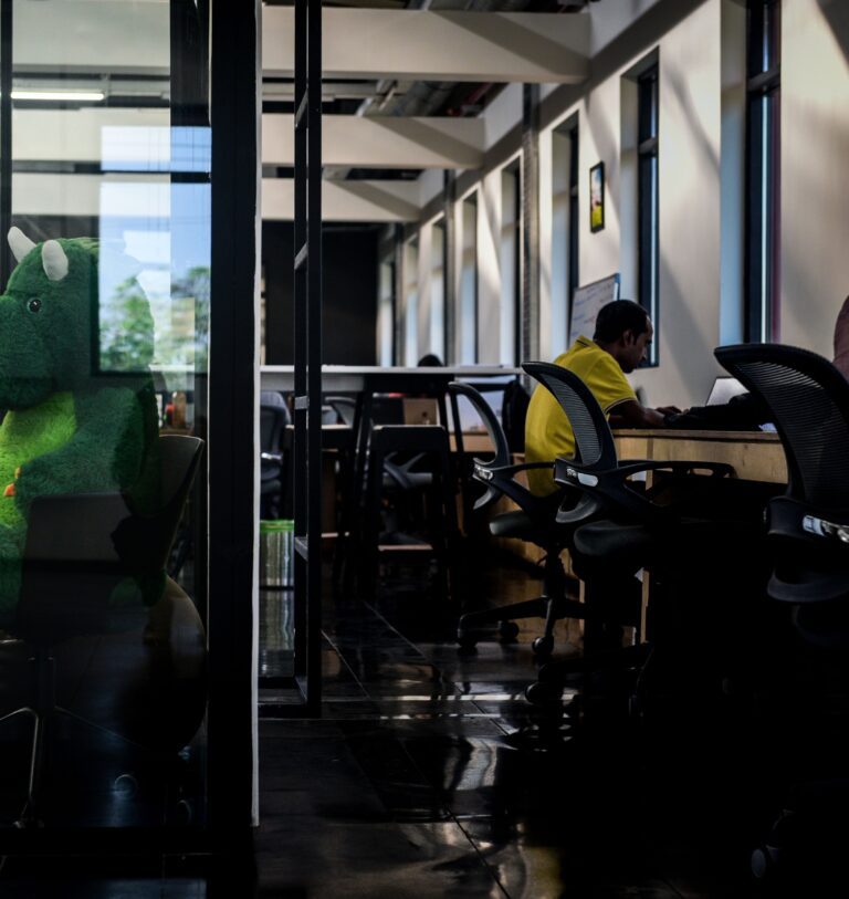To encourage productivity and collaboration, the office block’s interiors feature a flexible layout. Beyond an open plan with a balanced, symmetrical flow, meeting rooms are designed with rooftops that serve as mezzanine breakout spaces for employees, and are accessed via a ladder. Scattered with informal bean bags and chairs, these perch points inspire fresh outlooks. The contemporary workspace is also augmented by a courtyard that enables visual connection across the floors while also adding a refreshing touch of greenery to the interior space.