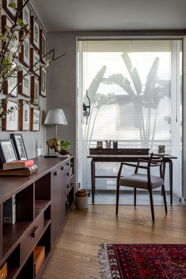 Alongside the piano, there is a red scuplture of monkeys, inspired by the infamous Gandhi’s “three wise monkeys”. This adds a pinch of contrast to imitate colours of life. The corner is occupied by the study, framed by a serene view of swinging trees and oak floors. This part of the house evokes a silent reflection of oneself through the art of reading.