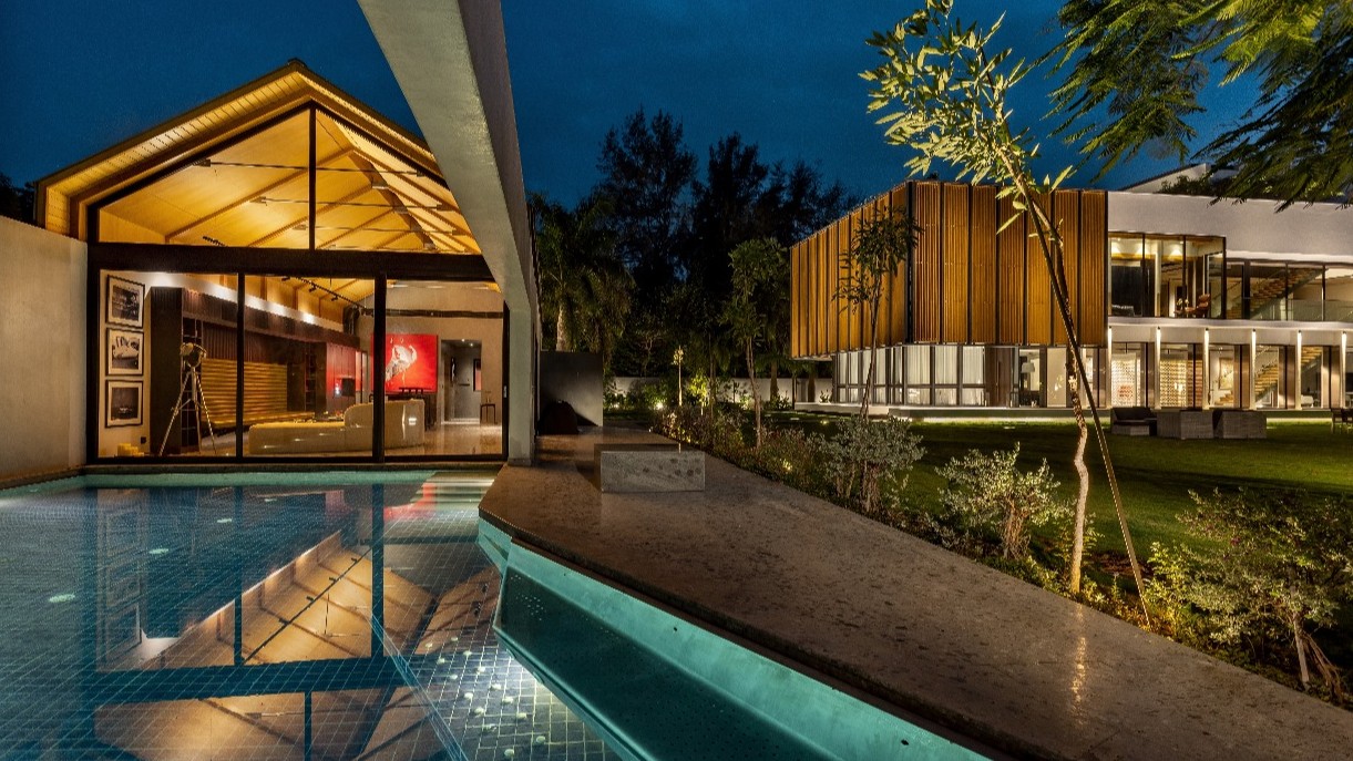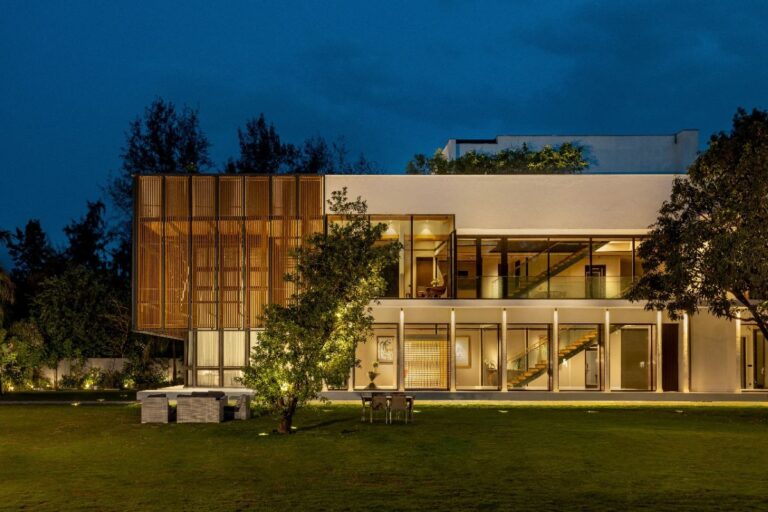 This New Delhi house by local firm Architecture Discipline makes the most of a one-acre site by arranging the accommodation around the edges of a generous lawn to create a sense of space and retreat. Described by the design team as a challenge to conventional urban living, the generous size of the plot enables the two separate structures to receive ample space, light and air.