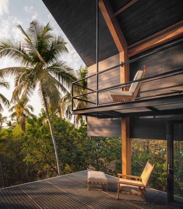 The beach house consists of stilts and concrete retaining walls. It is a single linear rock that has a pitched roof made by keeping in mind the Goa monsoon seasons. It is made of glulam or glued laminated timber that has structural integrity and a low carbon footprint, with strength comparable to steel.