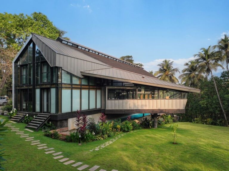 The beach house in the Goan village near Vagator beach has timber, using modern construction techniques. The structure consists of eleven glulam portal frames that define the central volume of the home