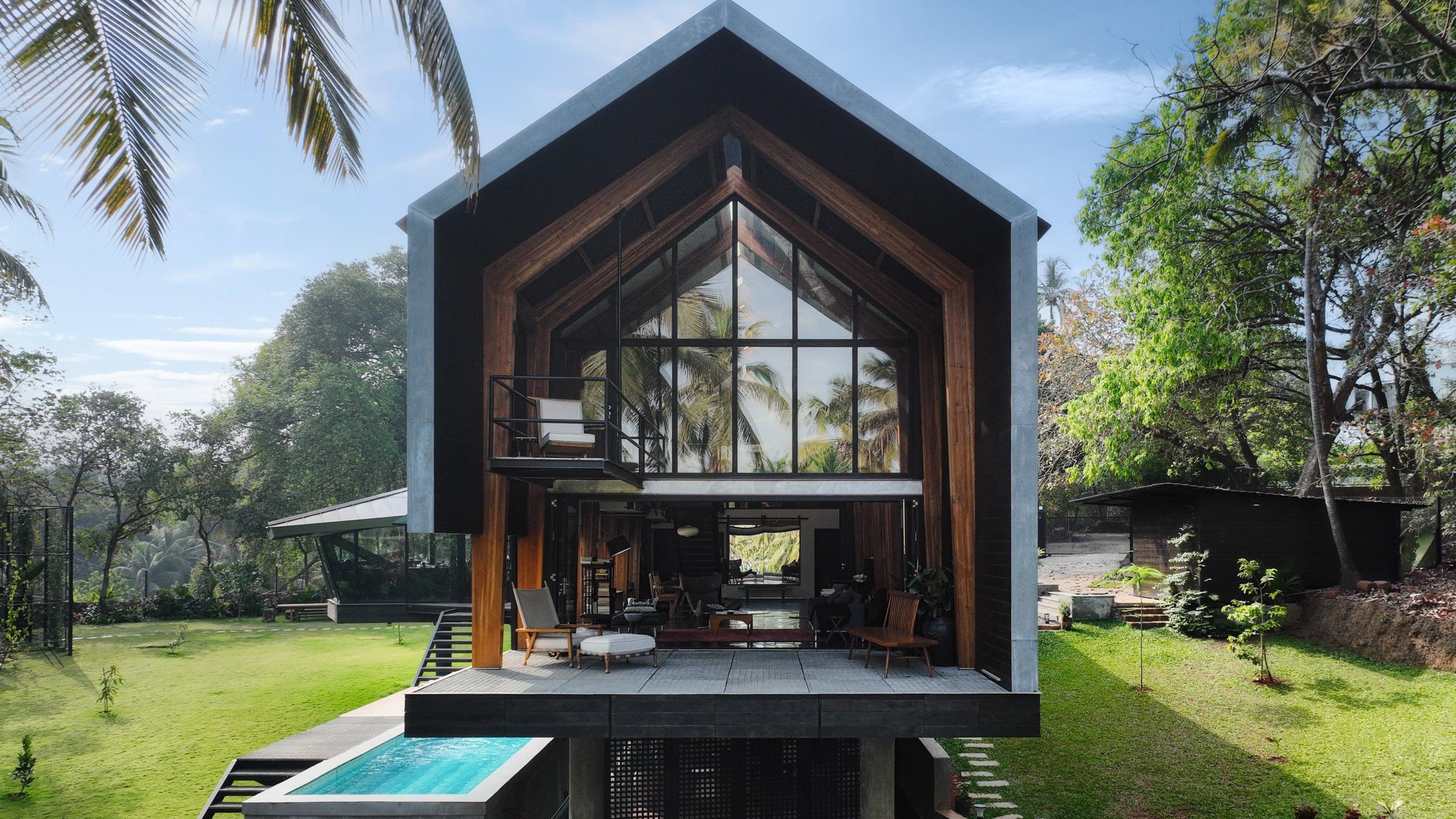 The beach house in the Goan village near Vagator beach has timber, using modern construction techniques. The structure consists of eleven glulam portal frames that define the central volume of the home