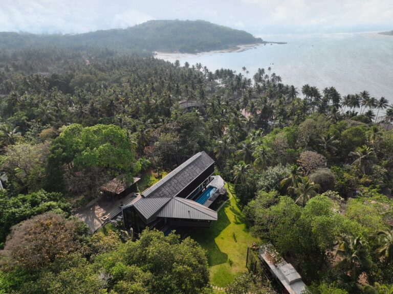 Nestled between Goa’s tropical greenery and the sea, the house is a tranquil sanctuary for the client. As a result, it offers the perfect retreat to recharge his creative energies. It not only sets a precedent for sustainable residential design in India but also nurtures the owner’s diverse pursuits. Moreover, it merges unconventional materials with cutting-edge technology to form a minimal and progressive residence.