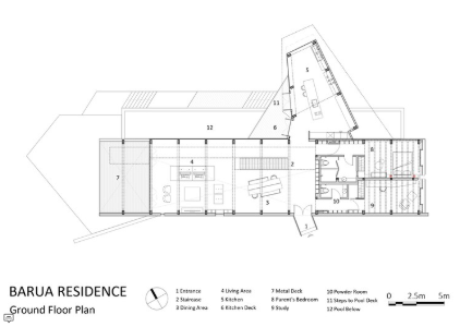 A light staircase leads to the mezzanine floor, which comprises a gallery passageway that overlooks the living space and leads to the master bedroom. The gallery is designed to showcase the client’s extensive collection of eclectic art. In contrast to the primary form of the home, the kitchen and dining space break out in the form of a projecting deconstructed space clad in metal. This architectural expression imbues the home with a sense of spatial delight and playfulness. The space overlooks the pool on one side and a kitchen garden on the other, creating an experience of being suspended in nature.