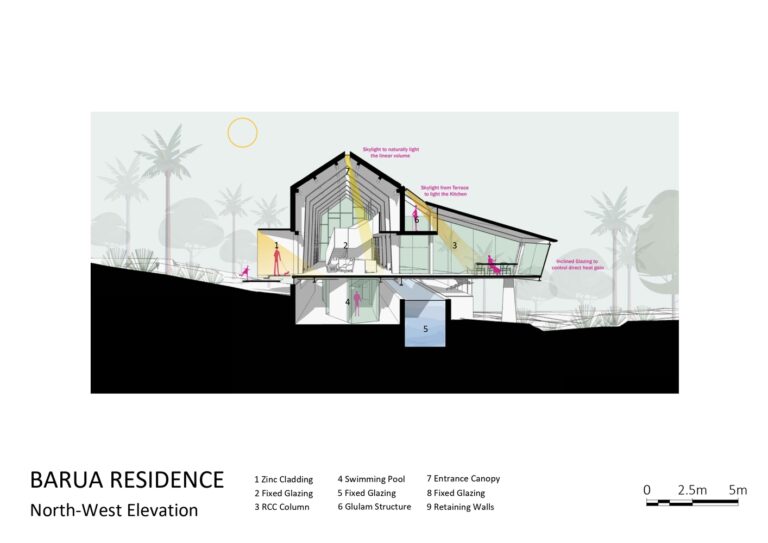 The client’s focused nature inspired the unidirectional form of the home– a single, linear block with a pitched roof tailored to Goa’s heavy monsoons. The superstructure comprises eleven glulam portal frames that define the central volume of the home. Glulam or glued laminated timber is a form of mass timber known for its structural integrity and low carbon footprint, with strength comparable to that of steel. Mass timber is a sustainable material emerging as a viable alternative to concrete and steel, two of the construction industry’s biggest contributors to carbon emissions.